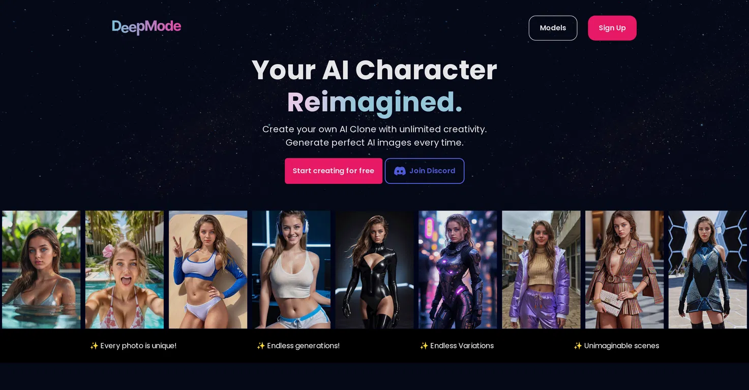 That’s where DeepMode comes in. It’s a beautifully designed platform that unites technology and desire—a space for play, creativity, and turning your fantasies into art. Imagine a private creative studio powered by AI, where you set the tone: soft, bold, romantic, or daring. This platform will help you transform your ideas into something stunning, safe, and unique.